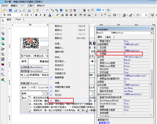 在設計器上,選擇模板下方“備注”文本框,右鍵屬性,可根據(jù)自己需求設置行間距