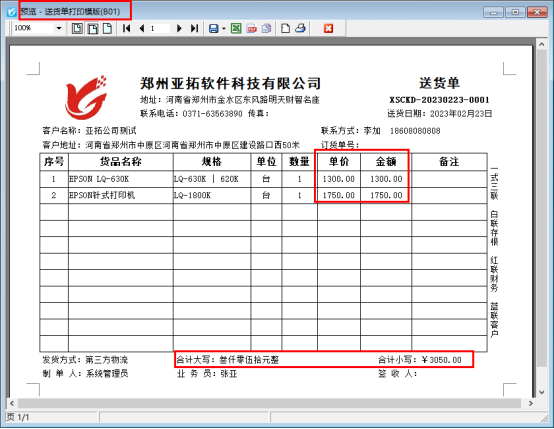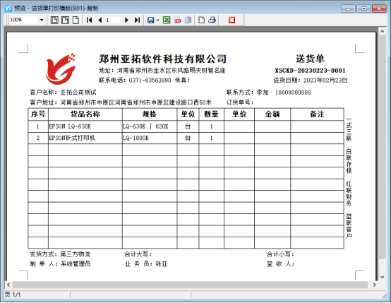 新開(kāi)一個(gè)銷(xiāo)售出庫(kù)單,打印下點(diǎn)擊打印預(yù)覽,默認(rèn)模板“送貨單打印模版(B01)”預(yù)覽界面如下所示,含單價(jià)和金額。