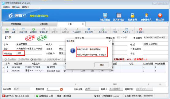 存在預(yù)收定金并已結(jié)銷的已完成狀態(tài)的訂單,紅沖單據(jù)的時(shí)候會(huì)提示“紅沖單據(jù)失敗,當(dāng)前訂單的預(yù)付款已結(jié)銷,不能刪除”如下圖所示: