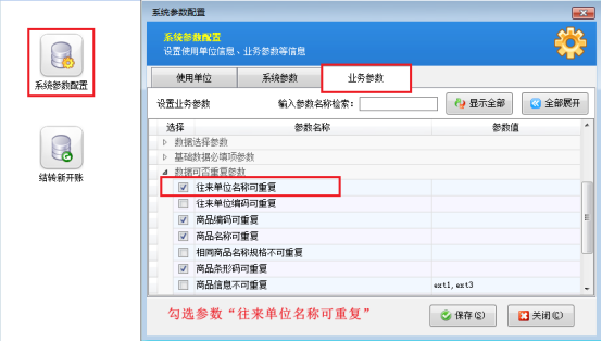 以信管飛RMS為例,在系統(tǒng)管理—》系統(tǒng)參數(shù)配置—》業(yè)務(wù)參數(shù)中的“數(shù)據(jù)可重復(fù)參數(shù)”勾選“往來單位名稱可重復(fù)”,然后保存設(shè)置。如下圖所示: