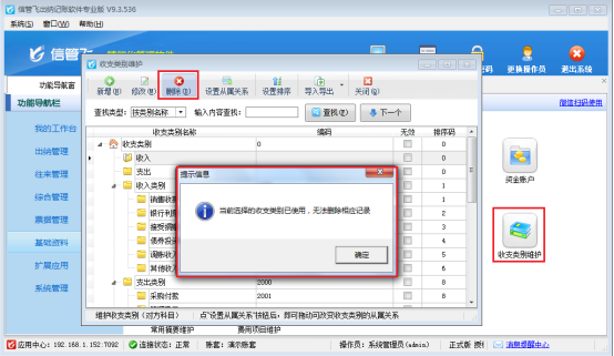 軟件支持日記賬收支類別維護(hù)設(shè)置,當(dāng)刪除收支類別時(shí)提示“當(dāng)前選擇的收支類別已使用,無法刪除相應(yīng)記錄”,怎么處理?