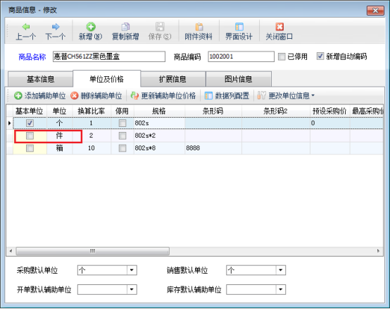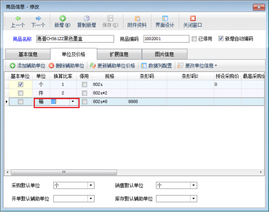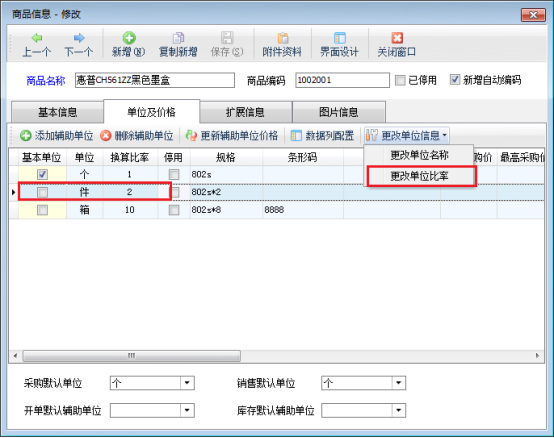 未開單使用過的輔助單位可以在單位及價格界面,單位、換算比率處直接進行修改。
