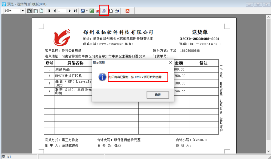功能導航窗點擊“業(yè)務(wù)處理”—》“新開送貨單”,新增一個送貨單,確認開單后點擊打印下的打印預覽,進入模板預覽界面。在打印預覽界面左上角點擊“復制為圖片可在微信/QQ中直接粘貼”按鈕,提示“打印內(nèi)容已復制,按Ctrl+V即可粘貼使用!”如下圖所示: