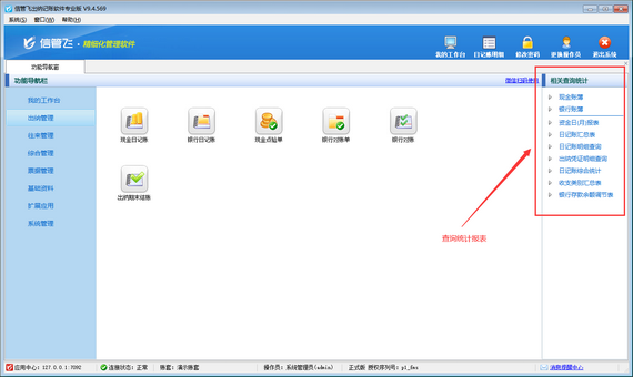 操作員權限設置完成后,使用操作員“張亞”登錄軟件,打開出納管理模塊,查看相關查詢統計報表,可以看到操作員賬號已無法查看到“日記賬匯總表”,如下圖所示。