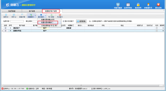 在功能導航窗點擊“基礎資料”—》“客戶信息”,“更多操作”下點擊“批量維護客戶信息”進入批量維護客戶信息界面,如下圖所示: