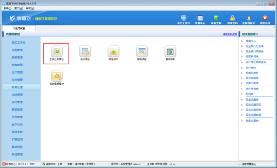 信管飛RMS專業(yè)版包含財務(wù)處理功能,可登記會計憑證,支持直接對已開單據(jù)進行快速生成會計憑證操作,如下圖所示。為避免操作員誤生成會計憑證,軟件支持設(shè)置操作員權(quán)限,本篇文章介紹下如何設(shè)置操作員不可使用生成業(yè)務(wù)憑證功能?