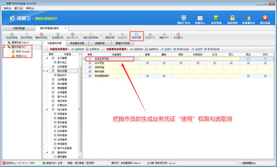 登錄軟件,在功能導(dǎo)航窗點擊“系統(tǒng)管理”—》“操作員及授權(quán)”,進入“操作員管理及授權(quán)”界面,選擇操作員“張亞”,在其右側(cè)的功能模塊權(quán)限內(nèi)選擇“財務(wù)處理”,將生成業(yè)務(wù)憑證的“使用”權(quán)限勾選取消,然后保存設(shè)置,如下圖所示。