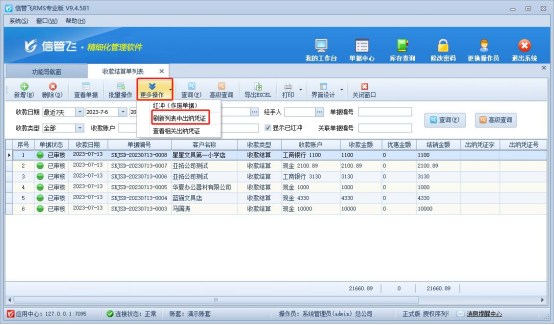 軟件默認打開結算單列表不顯示憑證字和憑證號,需要查看時在更多操作下點擊刷新列表中出納憑證。