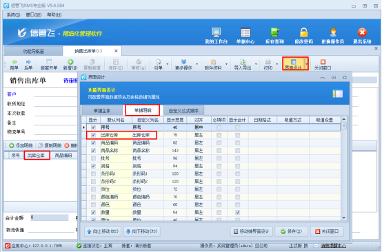 功能導(dǎo)航窗點(diǎn)擊銷售管理—》銷售出庫單,在銷售出庫單界面點(diǎn)擊工具欄“界面設(shè)計(jì)”,選擇單據(jù)明細(xì)項(xiàng),勾選顯示出庫倉庫,保存界面設(shè)計(jì),如下圖所示:
