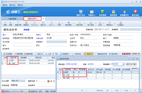 保存審核銷售出庫單,商品出庫數(shù)量分別為1個(gè),審核后再次打開明細(xì)工具欄“查看庫存”,可看到商品的兩個(gè)倉庫數(shù)量分別減去一個(gè),按照明細(xì)倉庫進(jìn)行出庫,如下圖所示: