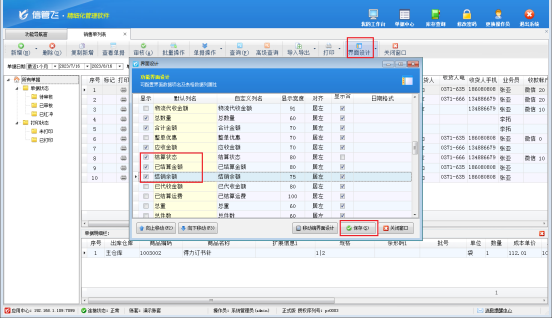 參數(shù)配置完成后,打開“銷售管理”—》“銷售單列表”界面,界面設(shè)計(jì)中把數(shù)據(jù)項(xiàng)“已結(jié)算金額、結(jié)算余額、結(jié)算狀態(tài)”勾選顯示,保存界面設(shè)計(jì),如下圖所示: