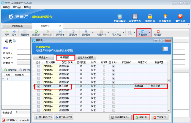 功能導航窗選擇“業務處理”,打開新開送貨單界面,點擊工具欄“界面設計”,界面設計單據明細中勾選顯示“擴展信息1”,自定義列名修改為“質檢結果”,取值方式選擇“數據字典”,取值設置選擇質檢結果數據項(沒有可先添加再選擇),保存界面設計。如下圖所示: