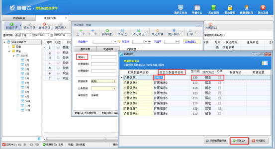 保存以后,在功能導(dǎo)航欄點擊“出納管理”進入日記賬界面,新增日記賬,在新增憑證窗口顯示“擴展信息”頁面可以錄入憑證的擴展信息,如下圖所示: