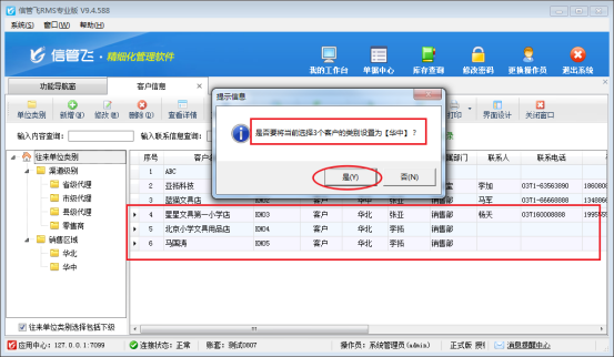 以上圖為例,單位類別是“華北”區域的一共有3條記錄,現在要把這3條記錄的單位類別改為“華中”區域。首先點擊第4行記錄,然后按下Shift鍵不松手時鼠標點擊第6行記錄,這樣就可以同時快速選中第4行至第6行這3條記錄,選中多條記錄后,再按住鼠標左鍵不松手,移動到單位類別“華中”區域處,此時系統會提示“是否要將當前選擇3個客戶的類別設置為【華中】?”,點“是”按鈕即可,如圖所示。