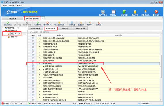 權(quán)限設(shè)置完成后,使用操作員賬號(hào)重新登陸軟件,重新標(biāo)記單據(jù)備注,即可成功標(biāo)記,如下圖所示。