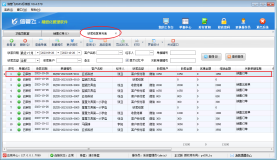 在功能導(dǎo)航窗打開(kāi)“往來(lái)管理”—》“收款結(jié)算單”,在收款結(jié)算單列表界面找到客戶銷(xiāo)售訂單的預(yù)付款單據(jù),雙擊打開(kāi)進(jìn)入收款結(jié)算單界面。