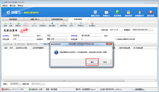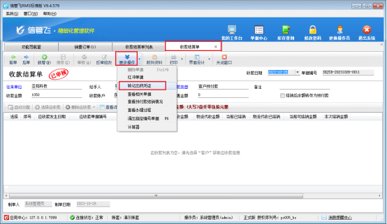 在收款結(jié)算單“更多操作”下點(diǎn)擊“轉(zhuǎn)記出納憑證”,點(diǎn)擊“確定”會(huì)彈出出納憑證新增界面,點(diǎn)擊保存即可,如下圖所示: