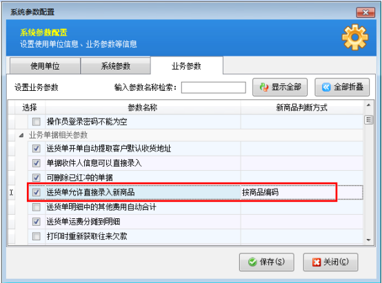 參數(shù)設(shè)置完成后,在業(yè)務(wù)參數(shù)中找到參數(shù)“送貨單允許直接錄入新商品”,新商品判斷方式修改為“按商品編碼”,然后開單新增新商品,會按商品編碼進(jìn)行區(qū)分是否存在,不存在的商品會黑體加粗顯示,如下圖所示: