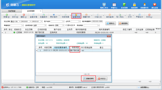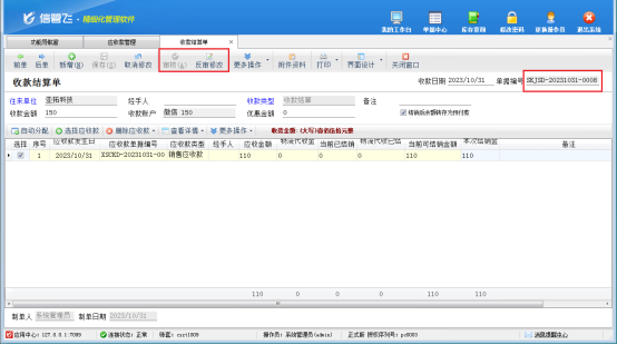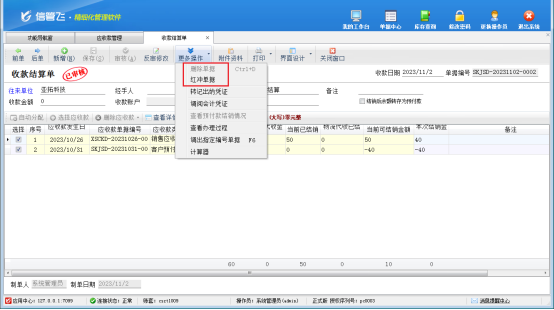 然后,選中此已結銷的客戶預付款記錄,在工具欄點擊“查看結銷”—》“查看結算單”,打開此客戶預付款的結銷記錄,更多操作下將此客戶預付款結銷記錄先紅沖后刪除,此時單據(jù)編號為“SKJSD-20231031-0008”的收款結算單即可反審修改成功,如下圖所示。