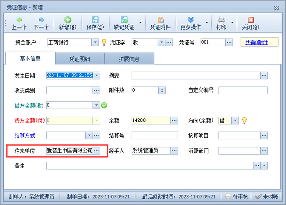 出納記賬軟件在登記出納憑證時,支持將往來單位擴展信息提取到憑證的擴展信息內顯示,有用戶需要提取往來單位的開戶銀行和銀行賬號信息到出納憑證內顯示,本篇文章介紹一下操作方法。