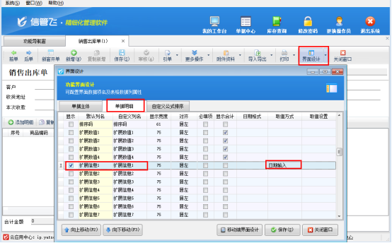 功能導航窗選擇“銷售管理”,打開銷售出庫單界面,點擊工具欄“界面設計”,界面設計單據明細中勾選顯示“擴展信息1”,取值方式選擇“日期輸入”,保存界面設計。如下圖所示: