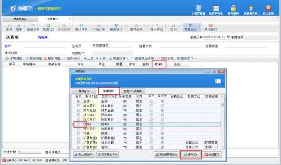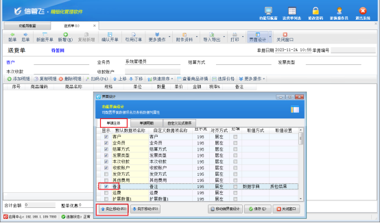 界面設(shè)計窗口中可分別對單據(jù)主體、單據(jù)明細(xì)進(jìn)行設(shè)計,點擊“單據(jù)主體”,勾選需要顯示的數(shù)據(jù)項,不需要顯示的數(shù)據(jù)項可取消勾選,可以選擇上/下移動的方式與其他需要顯示的數(shù)據(jù)項移動到一起,然后點擊“保存”按鈕即可,單據(jù)明細(xì)的設(shè)置與主體類似,如下圖所示,單據(jù)主體中可以將“備注”勾選出來,單據(jù)明細(xì)中可將“稅率”取消顯示。