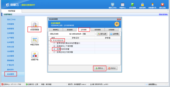 在功能導航窗點擊“系統管理”—》“系統參數配置”—》“業務參數”,即可進入到“業務參數”配置界面,在系統預警參數內將“啟用負庫存預警”參數勾選啟用,設置完成后點擊“保存”按鈕保存配置,如下圖所示。