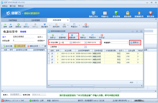 選擇應收款界面勾選發生日期,選擇日期范圍后點擊“查詢”刷新,批量選擇點擊工具欄“批量選擇”下的“全選”,會批量勾選記錄,繼續點擊“選擇”按鈕,如圖所示: