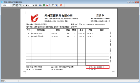 本文以“信管飛送貨單軟件”為例,示范下打印模板如何設置金額取整顯示并且不進行四舍五入,新開一個送貨單,金額存在小數(shù),打印預覽圖如下:
