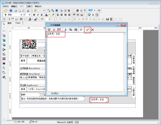 第一種情況:業(yè)務(wù)員名字固定顯示,雙擊打開(kāi)添加的文本框,直接輸入內(nèi)容,示例內(nèi)容“業(yè)務(wù)員:王五”,之后點(diǎn)擊“√”確定,添加完成后預(yù)覽模板如下圖所示: