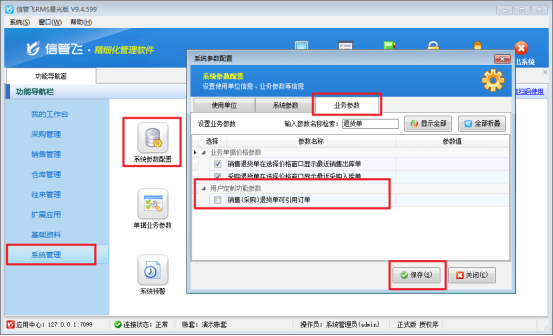 在功能導(dǎo)航窗點擊“系統(tǒng)管理”—》“系統(tǒng)參數(shù)配置”,進入系統(tǒng)參數(shù)配置界面,點擊“業(yè)務(wù)參數(shù)”,取消勾選“銷售(采購)退貨單可引用訂單”參數(shù),點擊保存按鈕,如下圖所示: