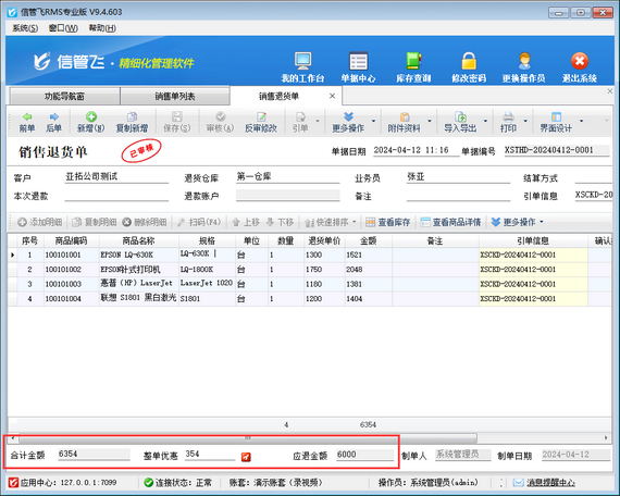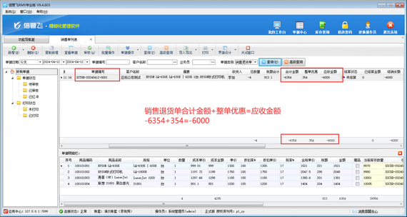 在銷售單列表中,銷售退貨單合計金額和應收金額為負數顯示,合計金額 + 整單優惠=應收金額,而不是合計金額 - 整單優惠=應收金額,如下圖所示。