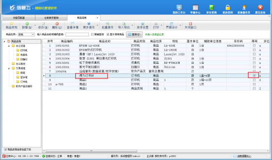 打開商品信息界面,示例商品“得力訂書針”設置已停用,直接打開倉庫庫存查詢界面無法顯示該商品。
