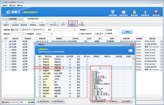 解決方法如下:請點擊“查詢”按鈕獲取到送貨明細匯總數據后,重新在工具欄打開“界面設計”功能,即可配置單據日期格式,如下圖所示。