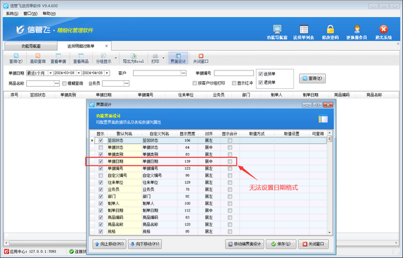 出現以上問題的原因是:打開送貨明細對賬單界面后,直接打開“界面設計”功能配置單據日期格式,沒有先“查詢”數據。