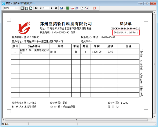 打開一個(gè)已開銷售單界面,點(diǎn)打印-打印預(yù)覽,首先預(yù)覽下當(dāng)前打印效果上的日期顯示,如下圖所示: