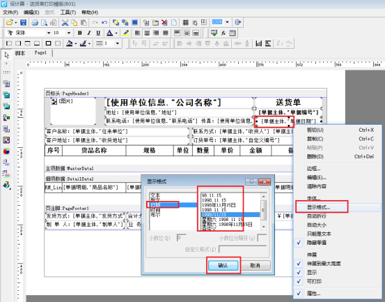解決方法如下:開單界面點(diǎn)打印-打印格式設(shè)計(jì),選中需要修改的模板,點(diǎn)“設(shè)計(jì)格式”,可進(jìn)入模板設(shè)計(jì)器界面,在模板設(shè)計(jì)器中選中“單據(jù)日期”文本框,鼠標(biāo)點(diǎn)擊右鍵,在彈出的界面上點(diǎn)擊“顯示格式”,進(jìn)入顯示格式設(shè)置界面,如下圖所示: