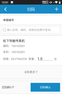 在掃碼界面,點(diǎn)擊Idata設(shè)備掃描按鈕,掃描商品條形碼添加商品明細(xì),可以查看商品名稱和商品數(shù)量,核對(duì)無誤后點(diǎn)擊掃碼確認(rèn),如下圖所示: