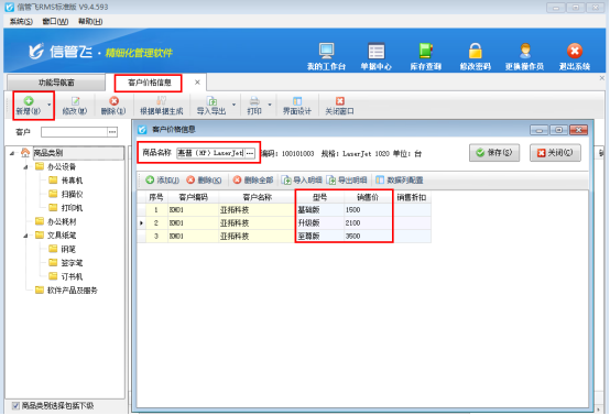 信管飛RMS軟件信管飛送貨單軟件等支持設置同一個商品可以設置不同的型號,且支持不同型號可以設置不同客戶價格,方便管理相同名稱不同型號有不同客戶價格的情況,本文以“信管飛RMS軟件”為例,示范下如何操作?