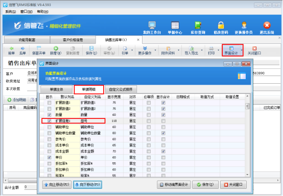 價格設置完成后,功能導航窗點擊“銷售管理”打開銷售出庫單,點擊“界面設計”,單據明細中勾選顯示“擴展信息1”,自定義列名修改為“型號”,保存界面設計,如下圖所示: