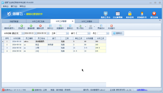 錄入計件數據:員工每工作一天或者每完成一道工序,你就可以在系統中錄入相應的計件數據。系統會根據你的設置,自動計算出員工的計件工資。