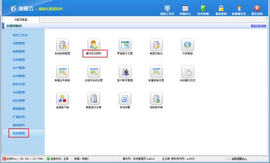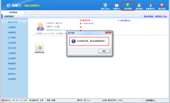 信管飛軟件支持設置多個操作員賬號并對操作員賬號設置權限,有用戶操作員賬號登錄時,查詢庫存可能會出現“您沒有操作權限,請與系統管理員聯系!”的提示,導致無法進行庫存查詢,這是由于操作員沒有權限造成的,本篇文章以“信管飛RMS專業版”為例介紹下如何解決?