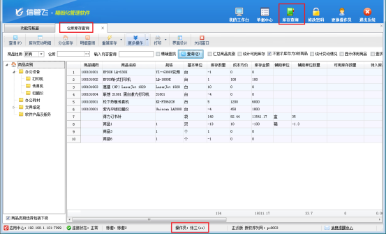 操作員權限設置完成后,使用操作員“張三”登錄軟件,點擊右上方庫存查詢,此時即可正常查詢庫存,如下圖所示。