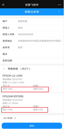 在外部客戶界面設(shè)計(jì),單據(jù)明細(xì)項(xiàng)取消勾選單價(jià)和金額,然后點(diǎn)擊保存按鈕,接收訂單消息詳情不能查看單價(jià)和金額,如圖所示: