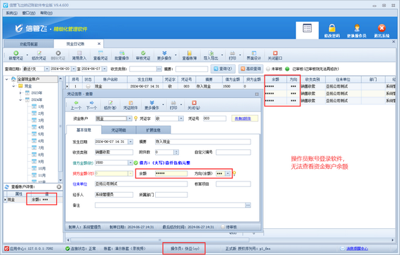 在資金賬戶余額管理方面,信管飛出納記賬軟件提供了嚴(yán)格的權(quán)限控制。企業(yè)可以設(shè)定特定操作員無法查看資金賬戶余額,從而有效防止敏感信息的泄露。這樣的設(shè)計不僅保護(hù)了企業(yè)的財務(wù)隱私,也增強(qiáng)了企業(yè)內(nèi)部的信任與協(xié)作。