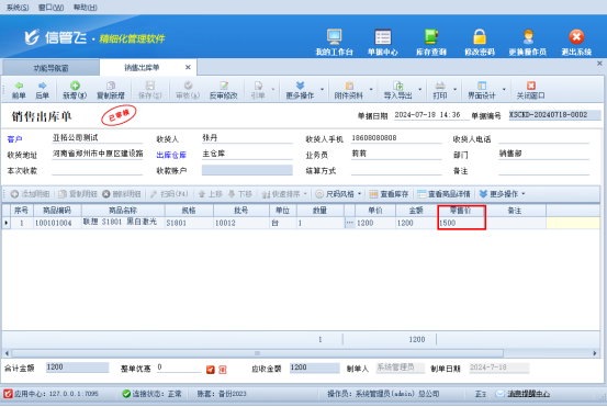 參數(shù)設(shè)置完成后,在功能導(dǎo)航窗點(diǎn)擊“銷售管理”—》“銷售出庫(kù)單”,新增銷售出庫(kù)單,銷售出庫(kù)開(kāi)單界面配置顯示出零售價(jià),客戶“亞拓軟件測(cè)試”需銷售商品“聯(lián)想 S1801 黑白激光打印機(jī)”,零售價(jià)為1500元。如下圖所示: