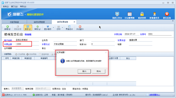 錄入開票日期、發(fā)票號、客戶名稱及開票金額等其他信息,如錄入紅字發(fā)票,開票金額請錄入負數(shù),如下圖所示。開票金額錄入負數(shù),保存發(fā)票時,系統(tǒng)會彈出提示信息“您錄入的開票金額為負數(shù),是否需要開紅字發(fā)票?”在彈出的提示信息窗口,點擊“是”確認填開紅字發(fā)票即可。