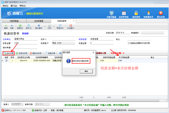 出現此提示原因是僅輸入了“收款金額”,沒有把收款金額分配到對應明細項的“本次結銷金額”中,軟件支持“自動分配”功能,輸入收款金額后點擊“自動分配”,可自動分配金額到“本次結銷金額”中,可方便有多條應收款明細時快速操作。如下圖所示: