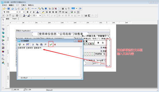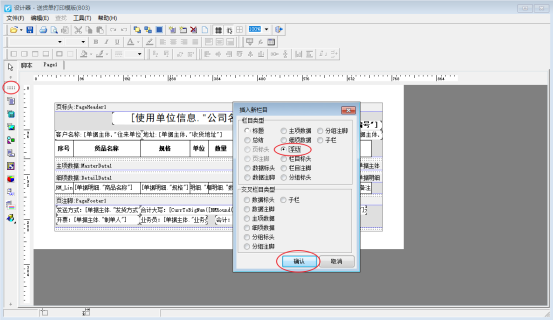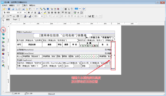 首先進入模板設計器界面(開單界面打印按鈕下點擊打印格式設計,在打印格式設計界面選擇模板點擊設計格式進入設計器界面),點擊左側工具欄的“插入邊條”,選擇“浮動”位置放到多聯備注處,包圍備注內容,如下圖所示: