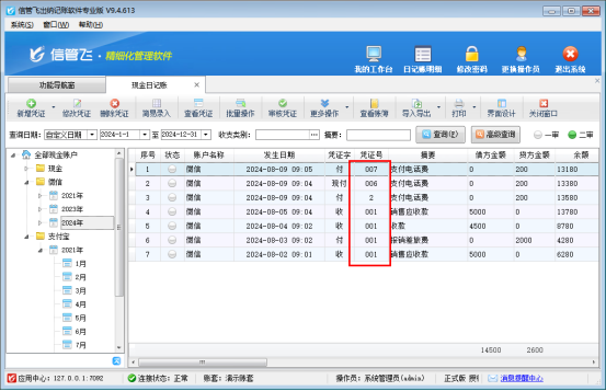 憑證號是出納憑證的重要標識,它記錄了每一筆經濟業務的唯一性,對于后續的賬務查詢分析至關重要。然而,在實際操作過程中,由于人為錯誤或系統調整等原因,可能會出現憑證號斷號的情況,這不僅影響了賬目的美觀性,還可能給后續的統計帶來困擾。信管飛出納軟件的日記賬檢查憑證號斷號功能,正是為了解決這一問題而生。問題如下圖所示: